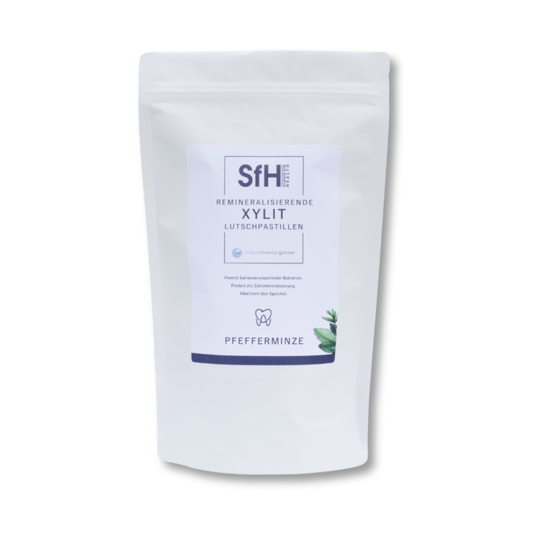 Xylit hungert kariesverursachende Bakterien wie Streptococcus mutans aus, ohne die nützliche Mundflora zu beeinträchtigen. Diese Bakterien können Xylit nicht verstoffwechseln, wodurch ihre Vermehrung gehemmt wird. Dadurch wird der Zahnschmelz remineralisiert und geschützt. Nach 10 Minuten Lutschen von Xylit-Pastillen steigt der pH-Wert des Speichels, was die Remineralisierung fördert. Zusätzlich wirkt das ätherische Pfefferminzöl antibakteriell und entzündungshemmend.