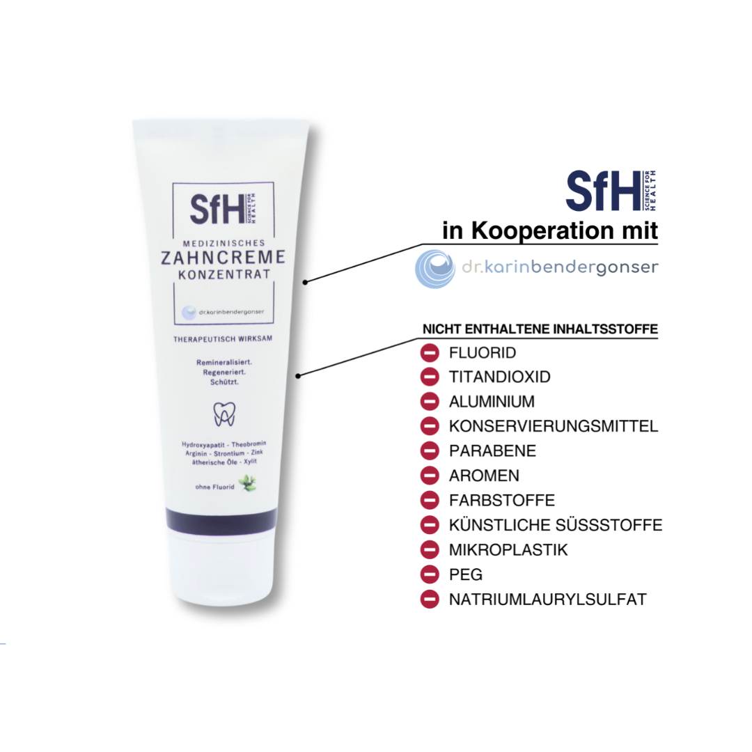 Das medizinische Zahncreme Konzentrat bietet tägliche und therapeutische Zahnpflege. Es stärkt und remineralisiert den Zahnschmelz, reduziert Schmerzempfindlichkeit, fördert ein basisches Mundmilieu und mindert Karies sowie Parodontitis. Frei von bedenklichen Stoffen, reicht das Konzentrat für 400-500 Anwendungen.